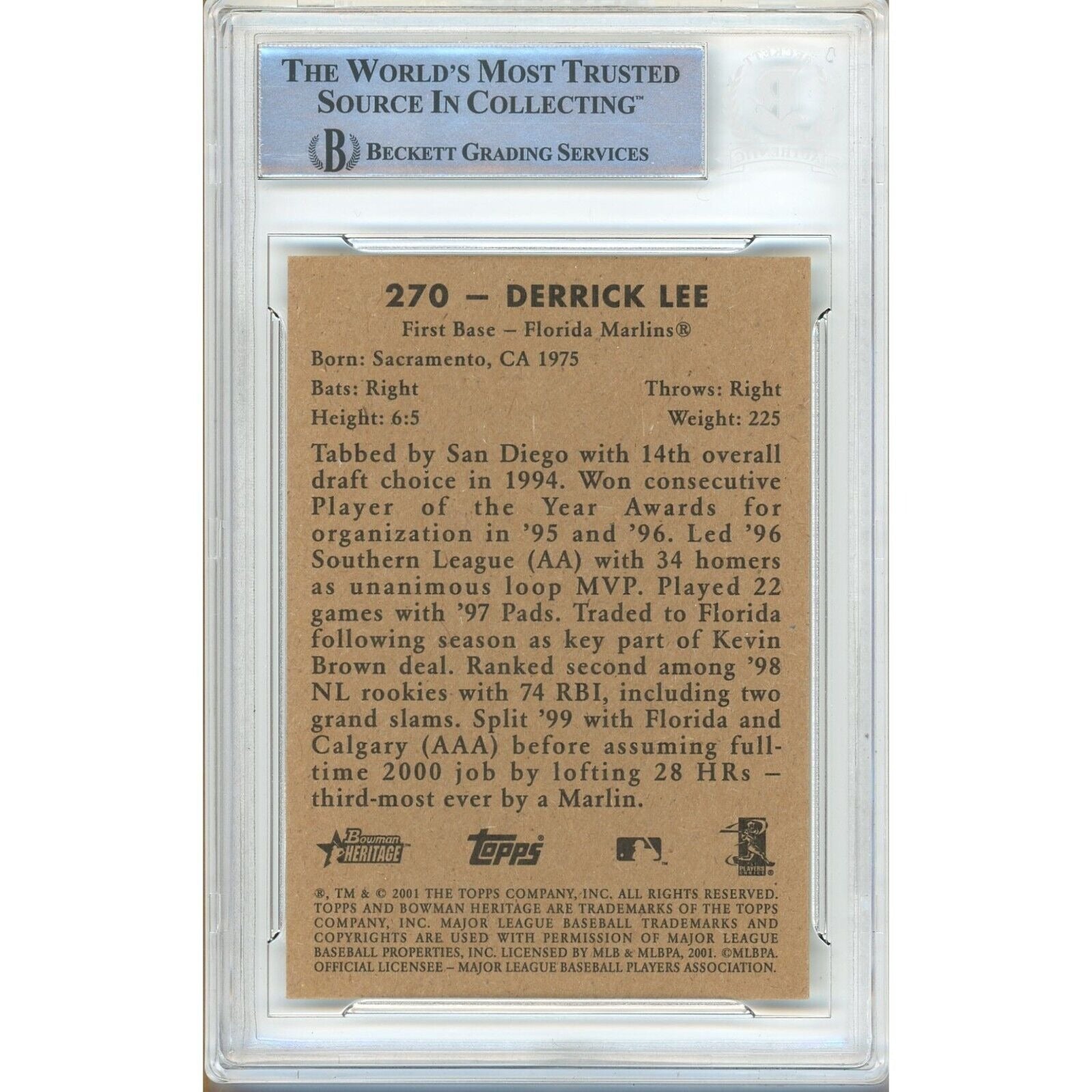 2001 Bowman Heritage #270 — Derrek Lee Miami Marlins Autographed Trading Card — Beckett Authentication