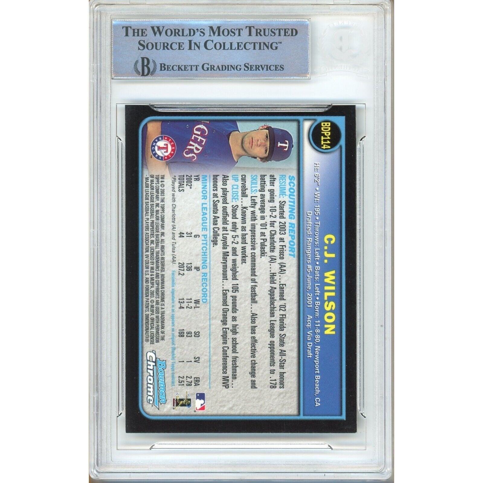 Experience a rare and coveted collector's item with the 2003 Bowman Chrome Draft Card, featuring the autograph of Texas Rangers player CJ Wilson. This valuable card has been certified and authenticated by Beckett Authentication Services (BAS), ensuring its genuine and high-quality status. As a rookie card from the major league baseball era, it holds immense value for fans of both the Texas Rangers and Los Angeles Angels. Encapsulated for optimal preservation and adorned with a distinctive, hard-signed autograph, it is a must-have for any sports trading card collection and a wise investment for collectors. Authenticated by experts at BAS, this original card bears CJ Wilson's signature in Blue Sharpie on card #411. Certification number: 00016502846.