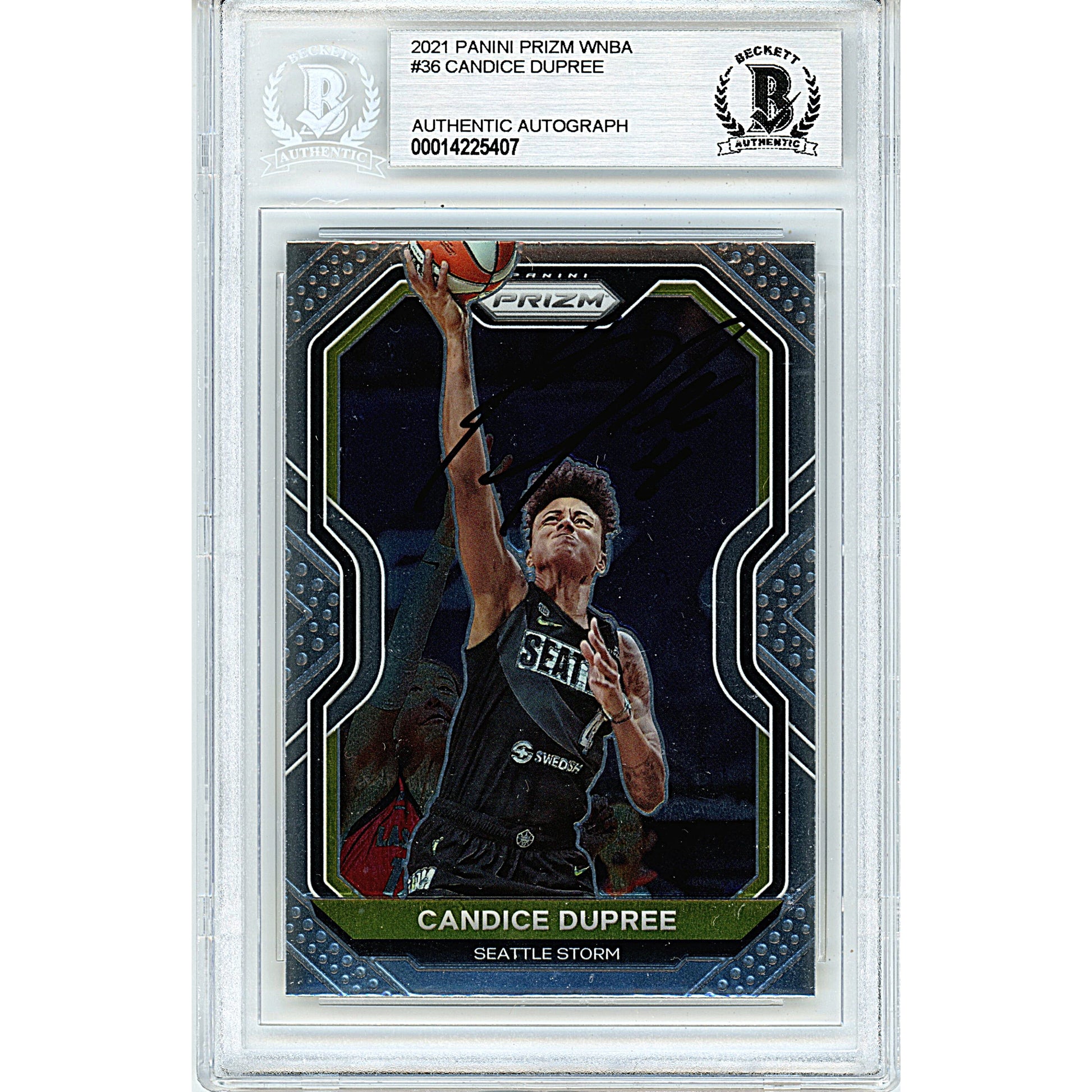 2021 Panini Prizm WNBA #36 — Candice Dupree Seattle Storm Autographed Trading Card — Beckett Authentication — authenticated by Beckett Authentication Services (BAS).