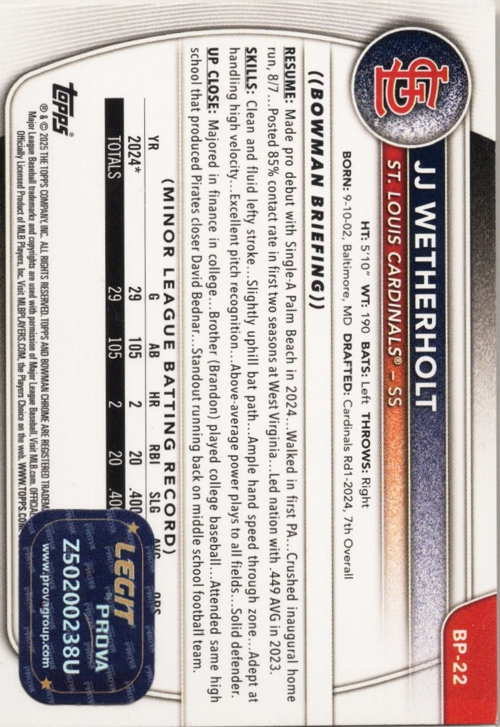 2025 Topps Bowman JJ Wetherholt #BP22 Signed St Louis Cardinals Rookie RC Baseball Card