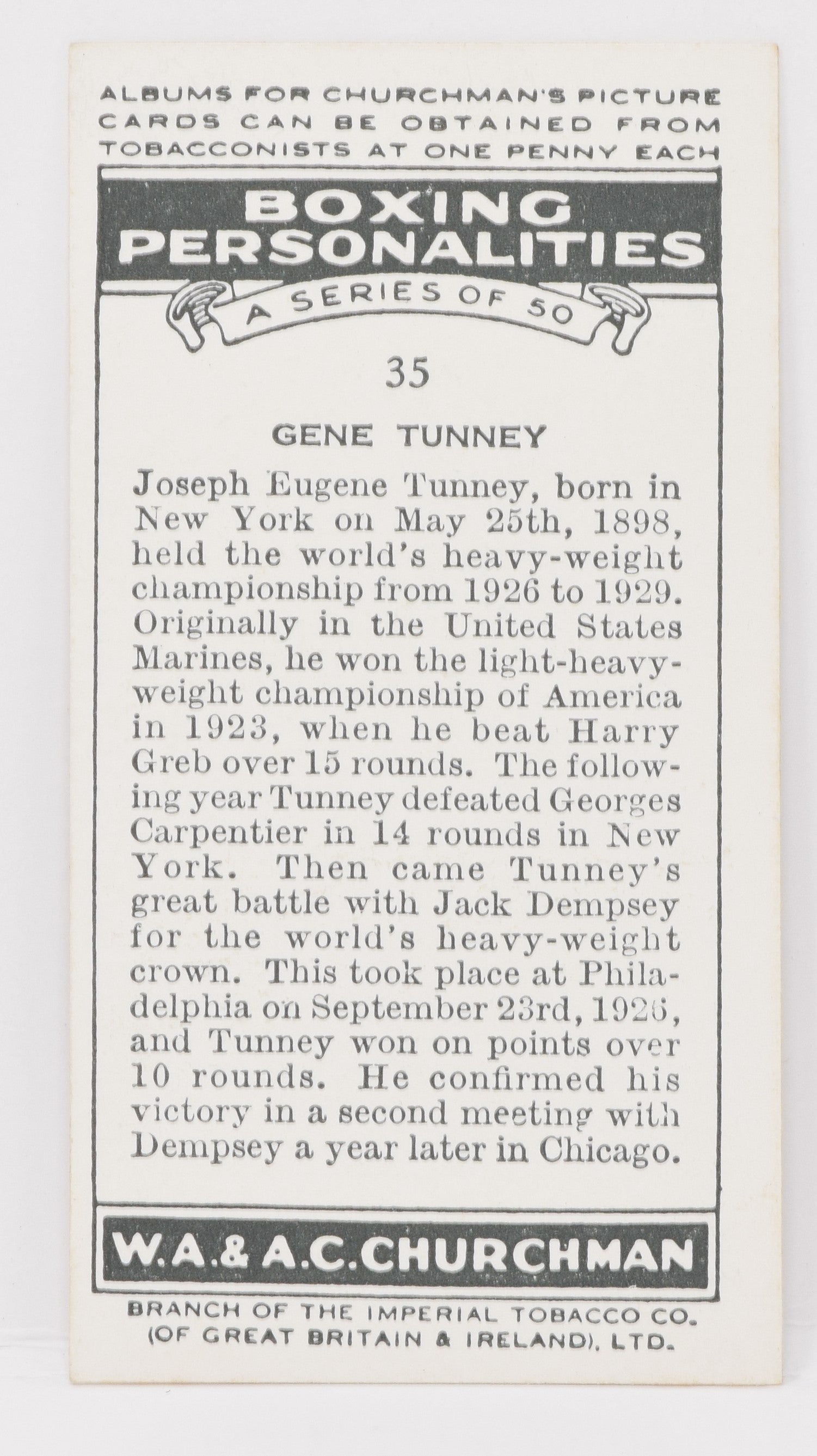 Gene Tunney #35 Churchman Cigarettes Boxing Personalities Boxer Card 1938