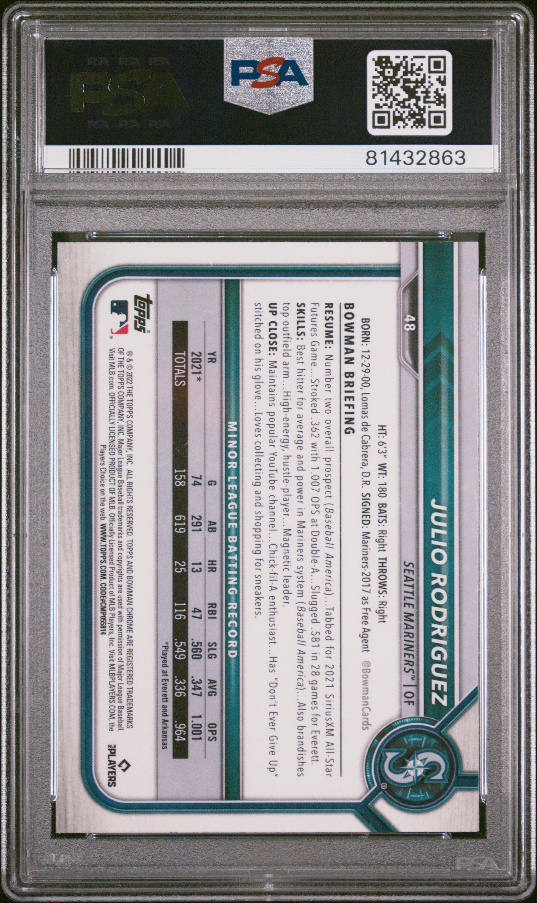 Graded 2022 Topps Bowman Chrome Julio Rodriguez #48 Rookie RC Baseball Card PSA 10 Gem Mint
