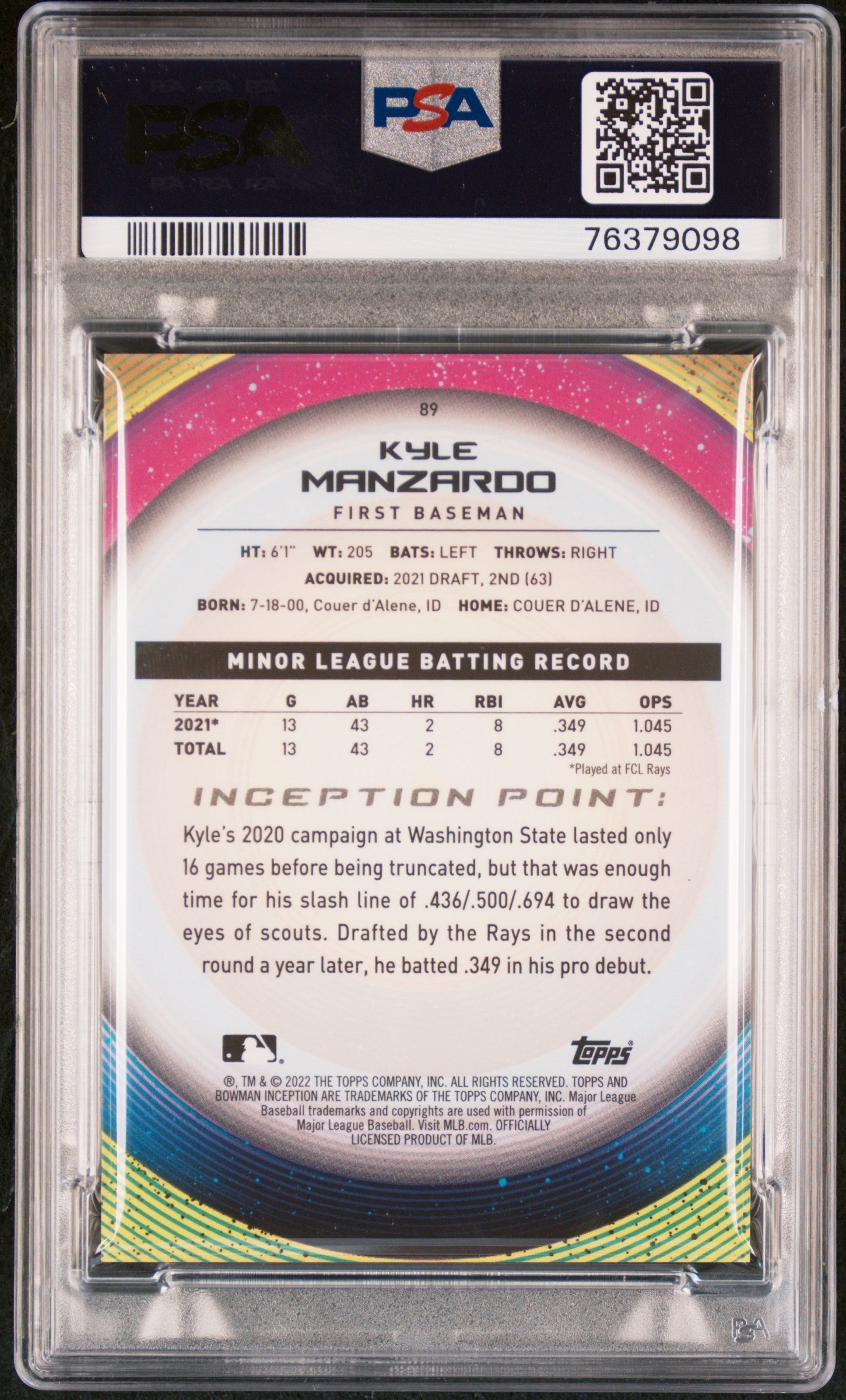 Graded 2022 Topps Bowman Inception Kyle Manzardo #89 Gold Foil Pattern II #/50 Rookie RC Baseball Card PSA 10 Gem Mint