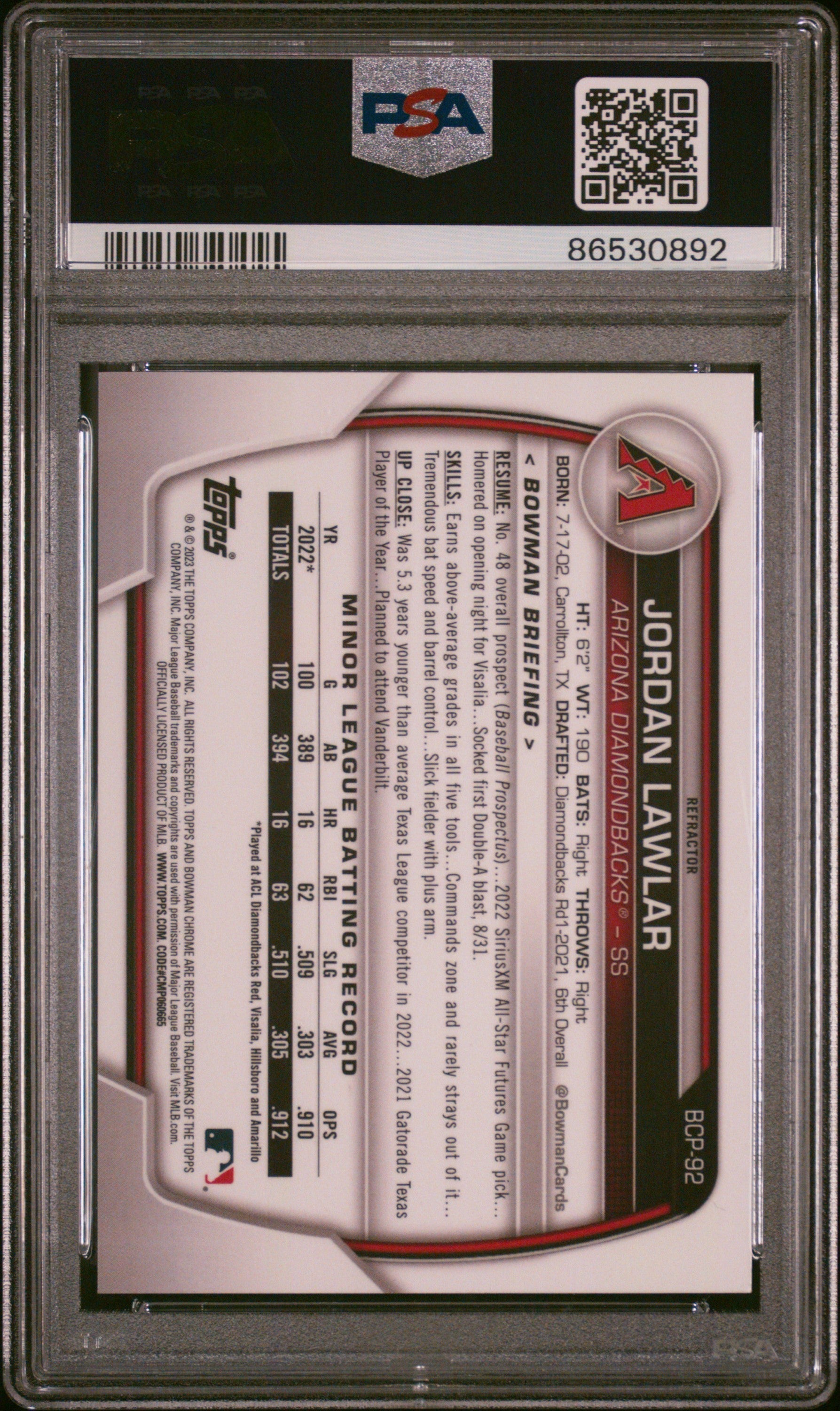 Graded 2023 Topps Bowman Jordan Lawler #BCP92 Chrome Prospects Refractor #/499 Rookie RC Baseball Card PSA 10 Gem Mint