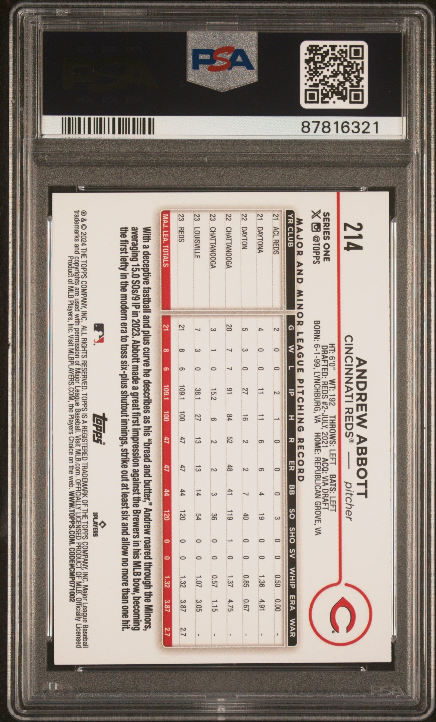 Graded 2024 Topps Andrew Abbott #214 Rainbow Foil Rookie RC Baseball Card PSA 10 Gem Mint