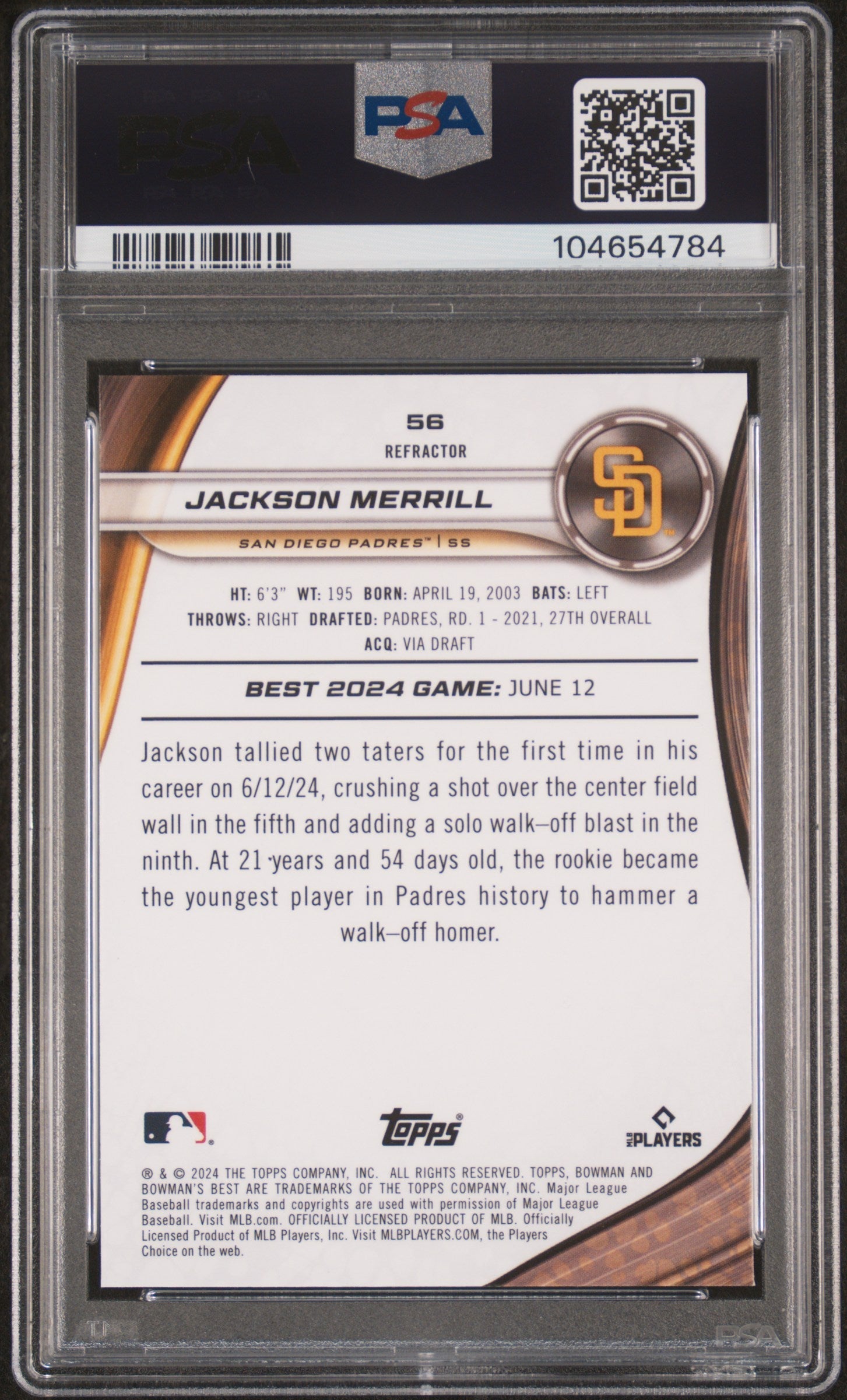 Graded 2024 Topps Bowmans Best Jackson Merrill #56 Refractor Rookie RC Baseball Card PSA 10 Gem Mint