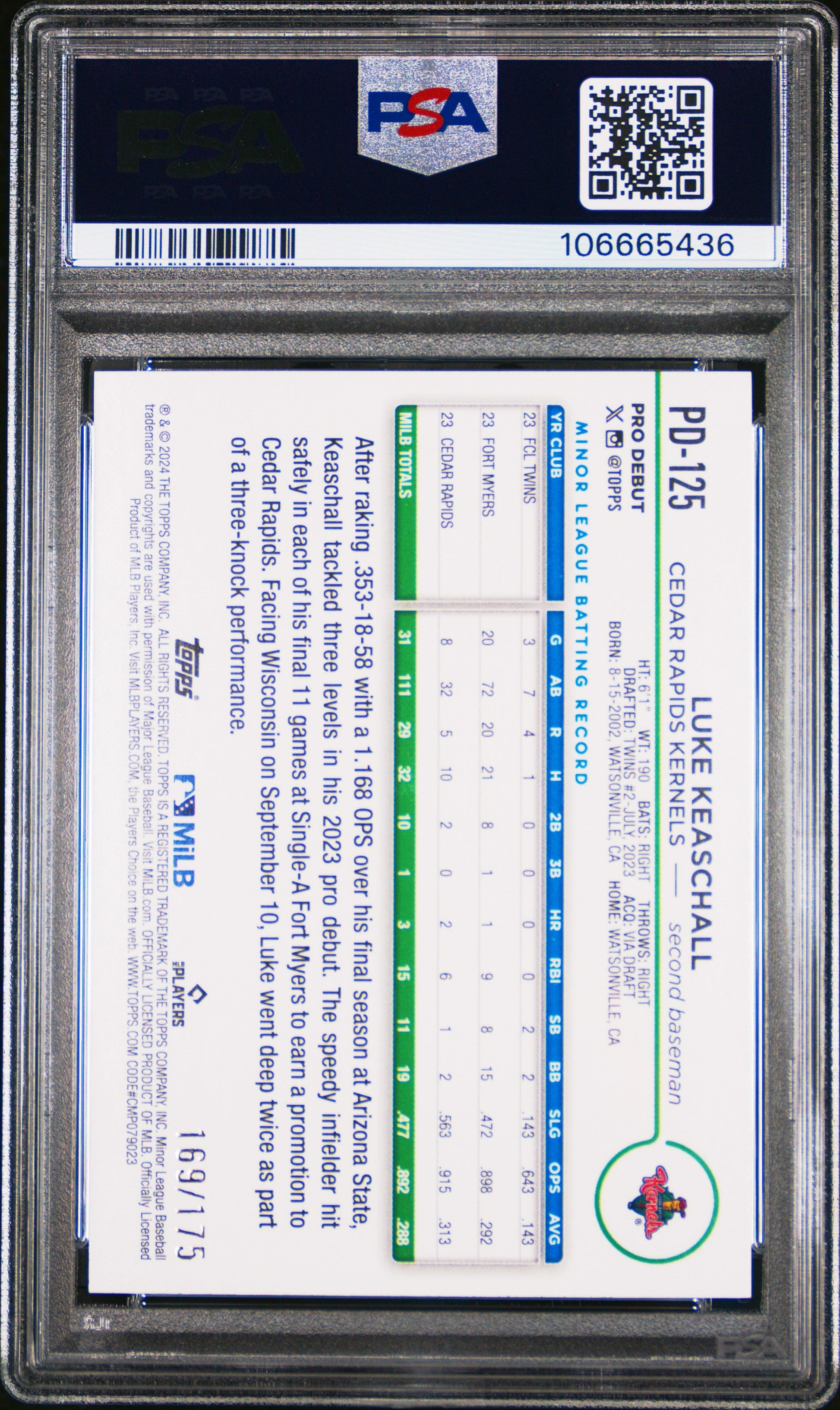 Graded 2024 Topps Pro Debut Luke Keaschall #PD125 Sparkle Foil /175 Rookie RC Baseball Card PSA 10 Gem Mint