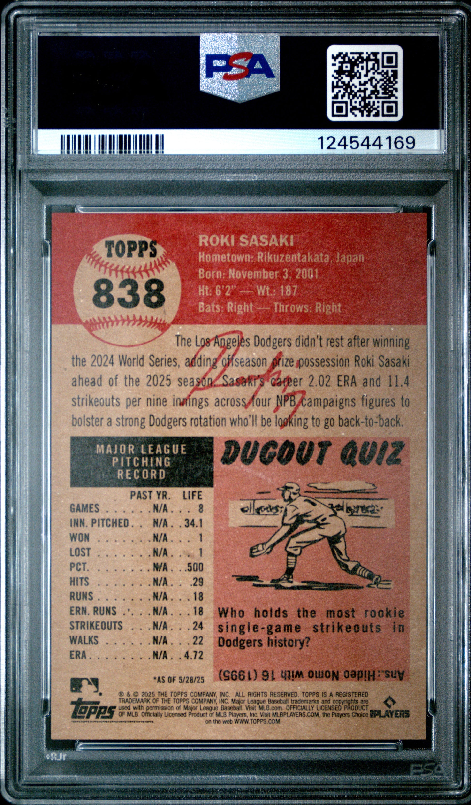 Graded 2025 Topps Living Roki Sasaki #838 Rookie RC Baseball Card PSA 10 Gem Mint