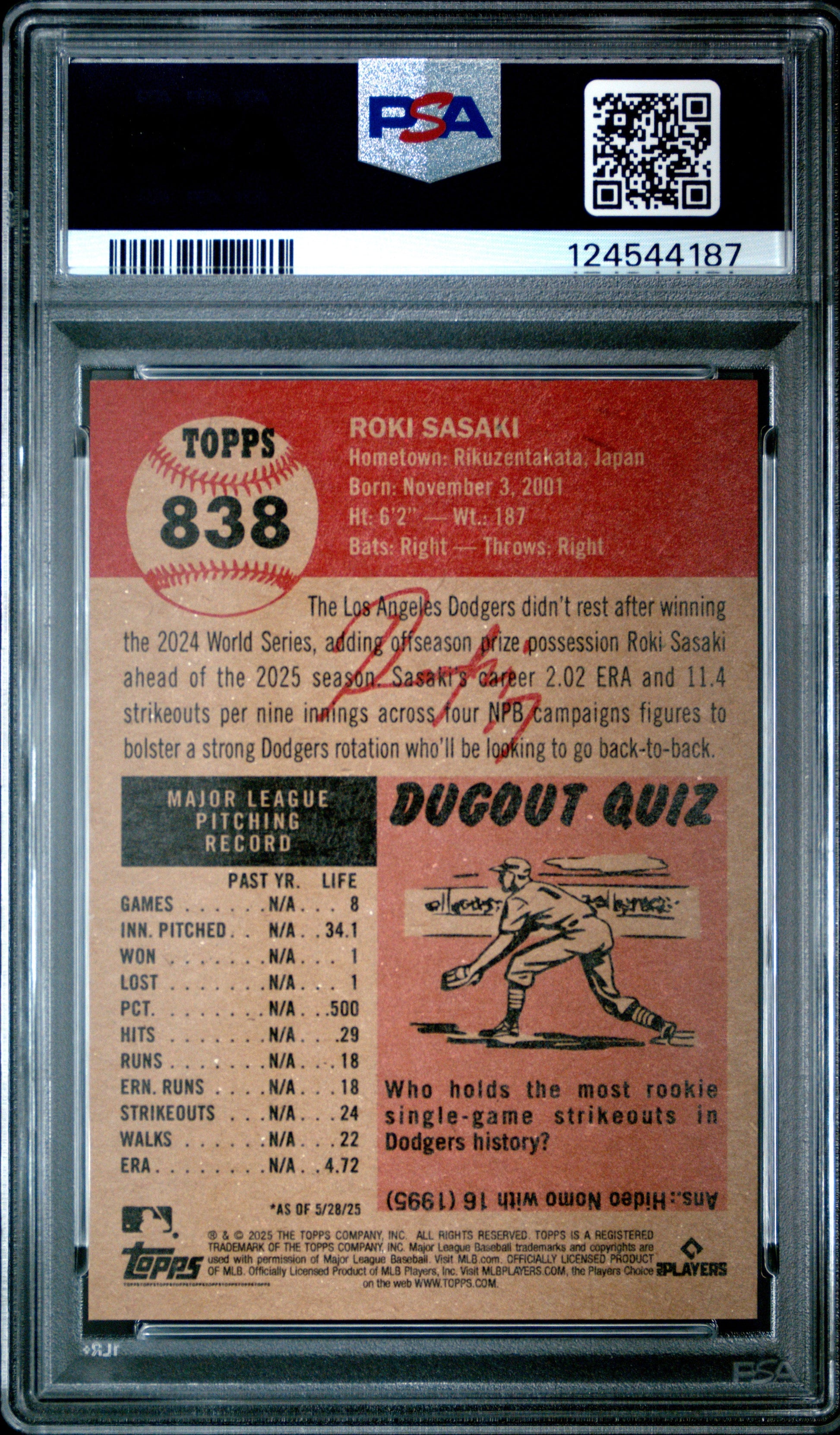 Graded 2025 Topps Living Roki Sasaki #838 Rookie RC Baseball Card PSA 8 Near Mint