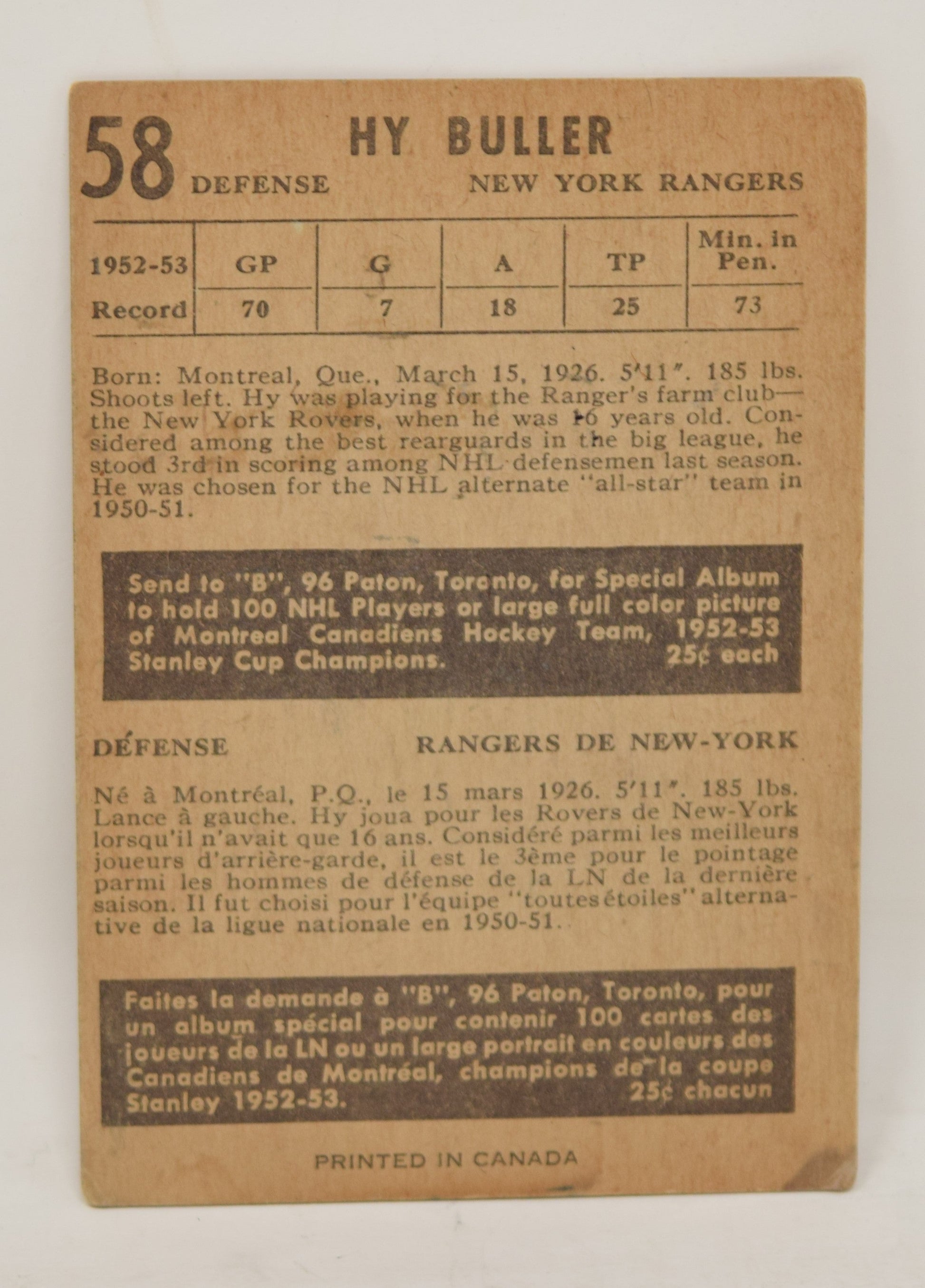 Hy Buller Hockey Card Parkhurst 1953 1954 New York Rangers 58