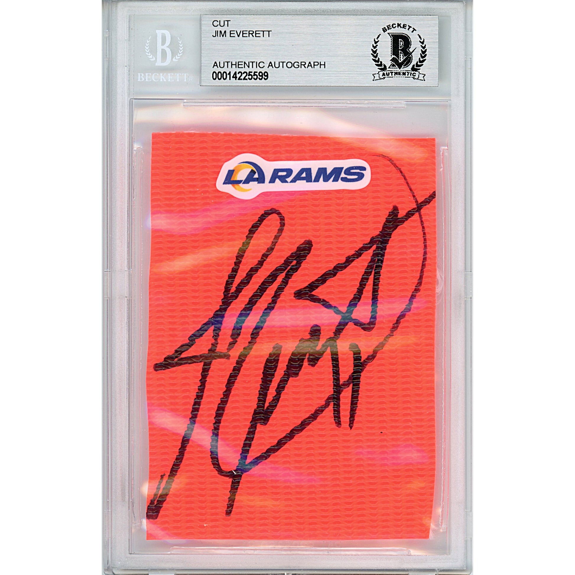This Jim Everett signed Los Angeles Rams football pylon piece has been certified authentic by Beckett Authentication Services (BAS). Encapsulated in a tamper-proof card protector, this pylon piece is the same size as a traditional trading card and can be verified on www.Beckett-Authentication.com with the authentication number 00014225599. Images can be enlarged for closer inspection, and our website offers a variety of other NFL and football autographed collectibles. Notable career accomplishments include leading the NFL in passing touchdowns in 1988 and 1989, being selected for the 1990 NFL Pro Bowl, and being chosen for the 1986 PFWA All-Rookie Team. Prior to playing in the NFL, Everett was a 1985 NCAA Third-Team All-American and a first round draft pick for Purdue University.
