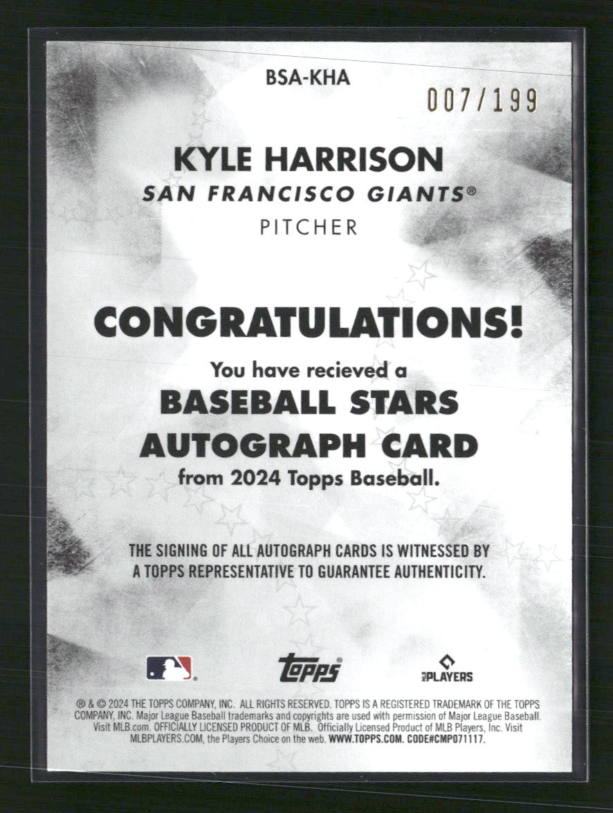 Kyle Harrison 2024 Topps #BSA-KHA Baseball Stars Autographs (Series One)