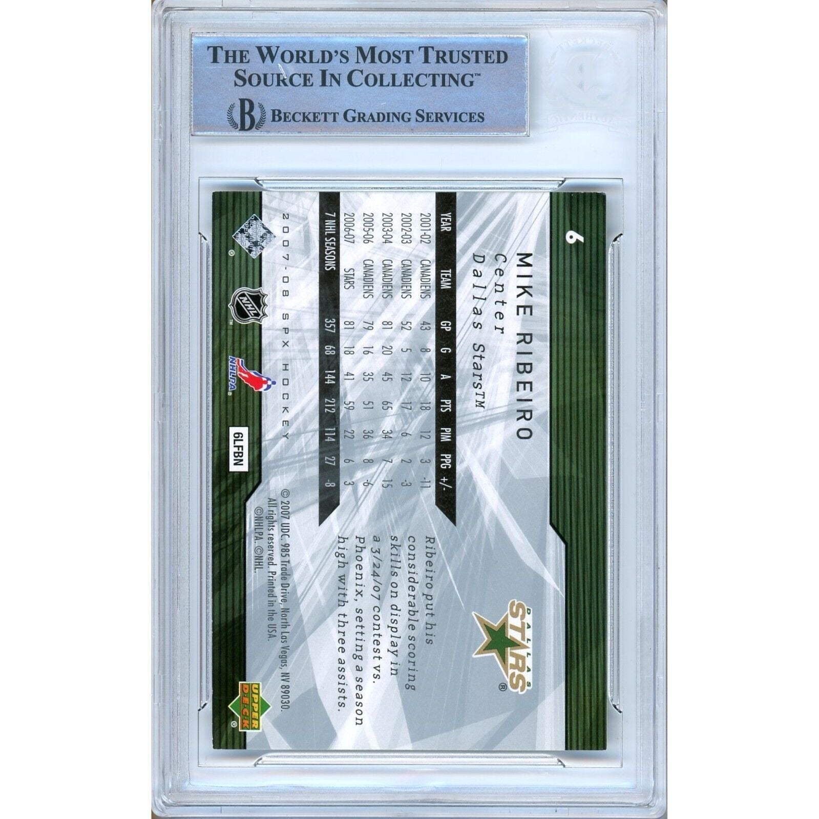 Mike Ribeiro Dallas Stars Signed 2007-08 UD SPx Hockey Card Beckett Authentic Auto Slab