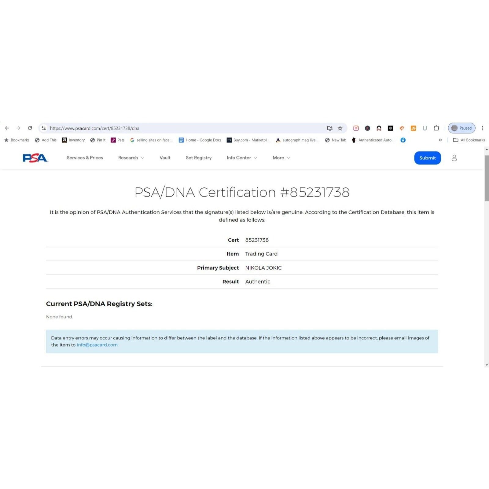 Own a rare piece of NBA history with this Nikola Jokic Denver Nuggets autographed 2016-17 Panini Donruss basketball card #68. It has been expertly authenticated and encapsulated by Professional Sports Authenticator (PSA) and its dual PSA slab serves as a certificate of authenticity (COA). The on-card autograph from the talented Denver Nuggets player makes this card a must-have for fans and collectors alike. Made of high-quality card stock material, this officially licensed trading card is an incredible addition to any memorabilia collection. Don't miss out on this opportunity to add this autographed card #252 to your collection. Authenticated and encapsulated by the professionals at PSA, this signature comes in black Sharpie and has certificate number 85231738.
