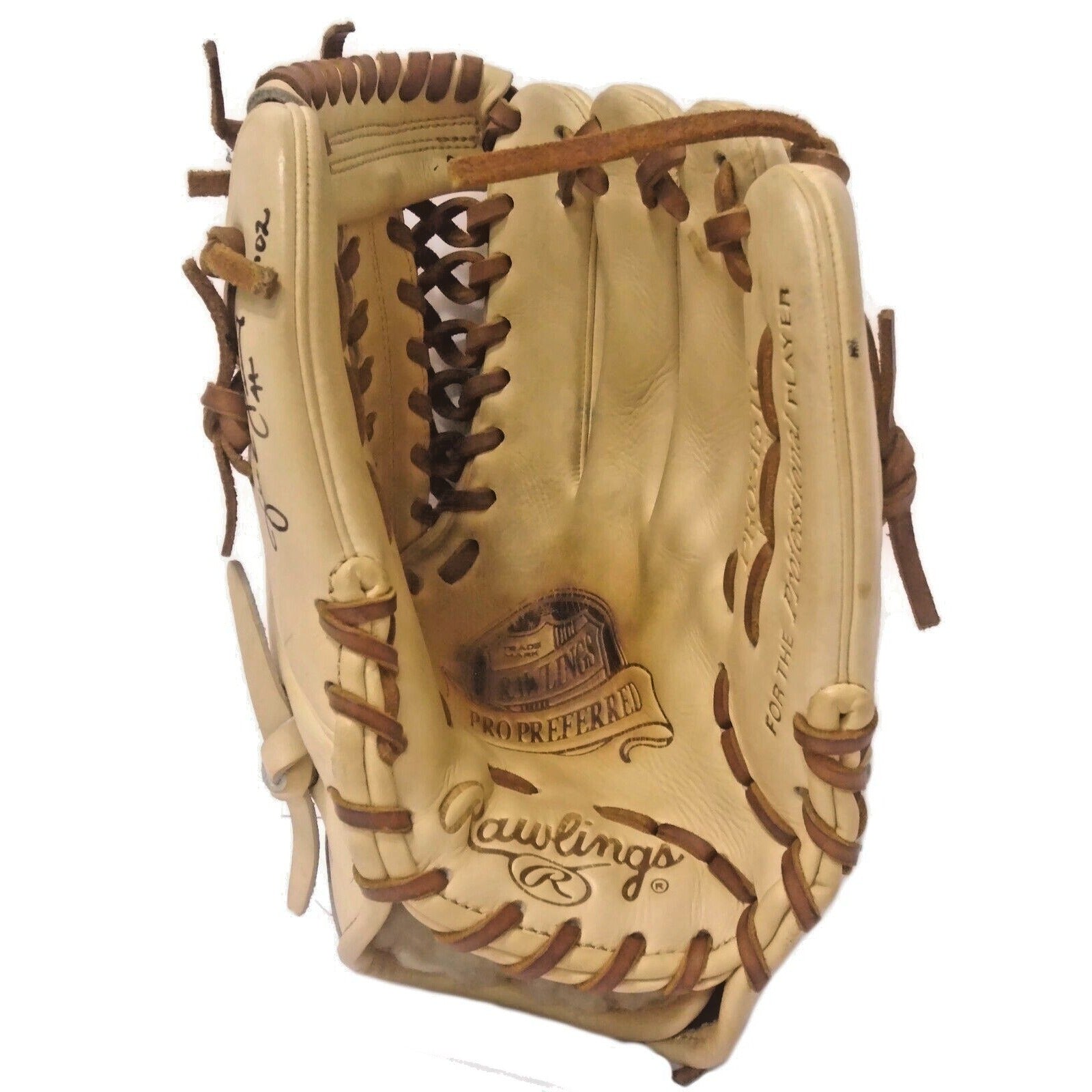 This game used baseball glove, autographed by rookie Jake Peavy of the San Diego Padres, has been certified by Beckett Authentication Services (BAS) with authentication number S38807. The official licensed glove features Peavy's autograph and is a unique piece of baseball history. It is a must-have addition for any collection, especially for fans of the Padres, Red Sox, White Sox, and Giants. Manufactured in the United States, this Rawlings Pro Preferred mitt was used by Peavy during his rookie season and personally obtained from him. It is autographed in black sharpie with the inscription '02, commemorating its use during his rookie season. This signature has been authenticated by Beckett Authentication Services with certificate number S38807.