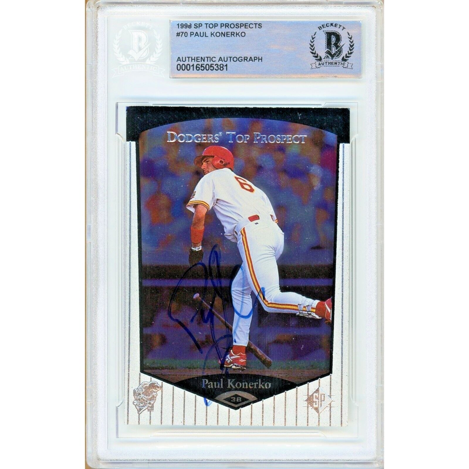 This autographed 1998 SP Top Prospects #70 Paul Konerko card is a valuable addition to any baseball card collection. Featuring an on-card autograph from the Chicago Whitesox and Los Angeles Dodgers player, it has been certified by Beckett Authentication Services (BAS) with authentication number 00016505381. The card is made with high-quality card stock and produced by Upper Deck, an officially licensed trading card manufacturer. With a hard signature format, it is part of the 1998 SP Top Prospects set and a rookie card. It also has a parallel/variety of autograph and is a vintage card, providing a great representation of Konerko's time with the Albuquerque Dukes - the former AAA affiliate of the Los Angeles Dodgers. The autograph is in Blue Sharpie and has been authenticated and encapsulated by the experts at Beckett Authentication Services (BAS). Certificate number 00016505381.