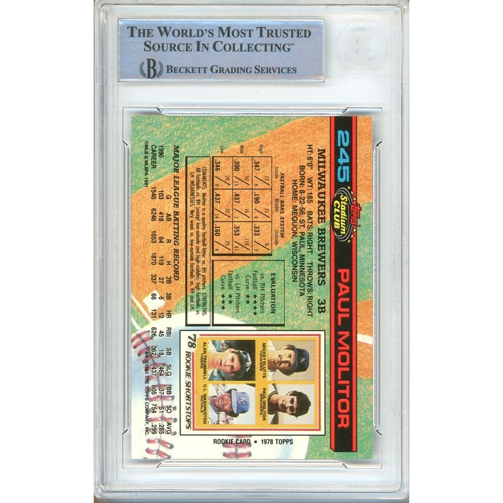 This 1991 Topps Stadium Club baseball card showcases baseball legend Paul Molitor's autograph. The card is an original and follows standard size and card stock specifications. It features a hard-signed autograph that has been authenticated by Beckett Authentication Services (BAS), with the authentication number 00016505940. The card is from Molitor's time with the Milwaukee Brewers, but he also played for the Toronto Blue Jays and Minnesota Twins in the Major League Baseball (MLB) league. The autograph is on-card and the card itself is encased in a Beckett slab. This is a must-have item for any baseball memorabilia collector or avid Paul Molitor fan. The autograph is signed in Black Sharpie, and the card is #245 in the 1991 Topps Stadium Club set. The authenticity of this autograph has been verified and confirmed by the experts at Beckett Authentication Services (BAS), with a certificate number of 00016505940.