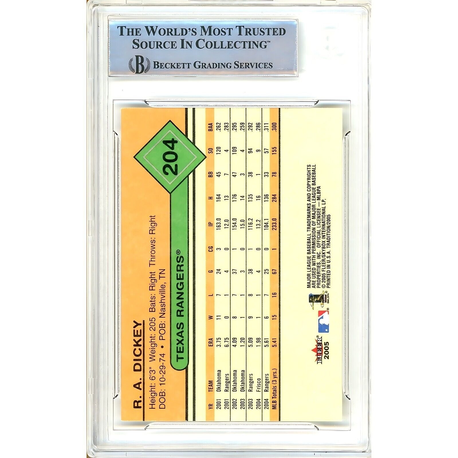 This trading card features the autograph of R.A. Dickey, a highly respected player who has played for multiple teams, including the NY Mets, Toronto Blue Jays, Texas Rangers, and others. Part of the 2005 Fleer Tradition set, this card has been officially authenticated by Beckett Authentication Services (BAS) with the unique authentication number 00016506487. Encapsulated and signed in a hard format, it also contains memorabilia from R.A. Dickey, making it a valuable addition to any baseball fan's collection. This trading card is officially licensed and crafted from high-quality card stock. With its exclusive features and exceptional authenticity, this card is a must-have for any sports trading card enthusiast. Signed in Blue Sharpie. R.A. Dickey Autographed Texas Rangers 2005 Fleer Tradition Baseball Card #204. Authenticated and encapsulated by the experts at Beckett Authentication Services (BAS). Certificate Number 00016506487.