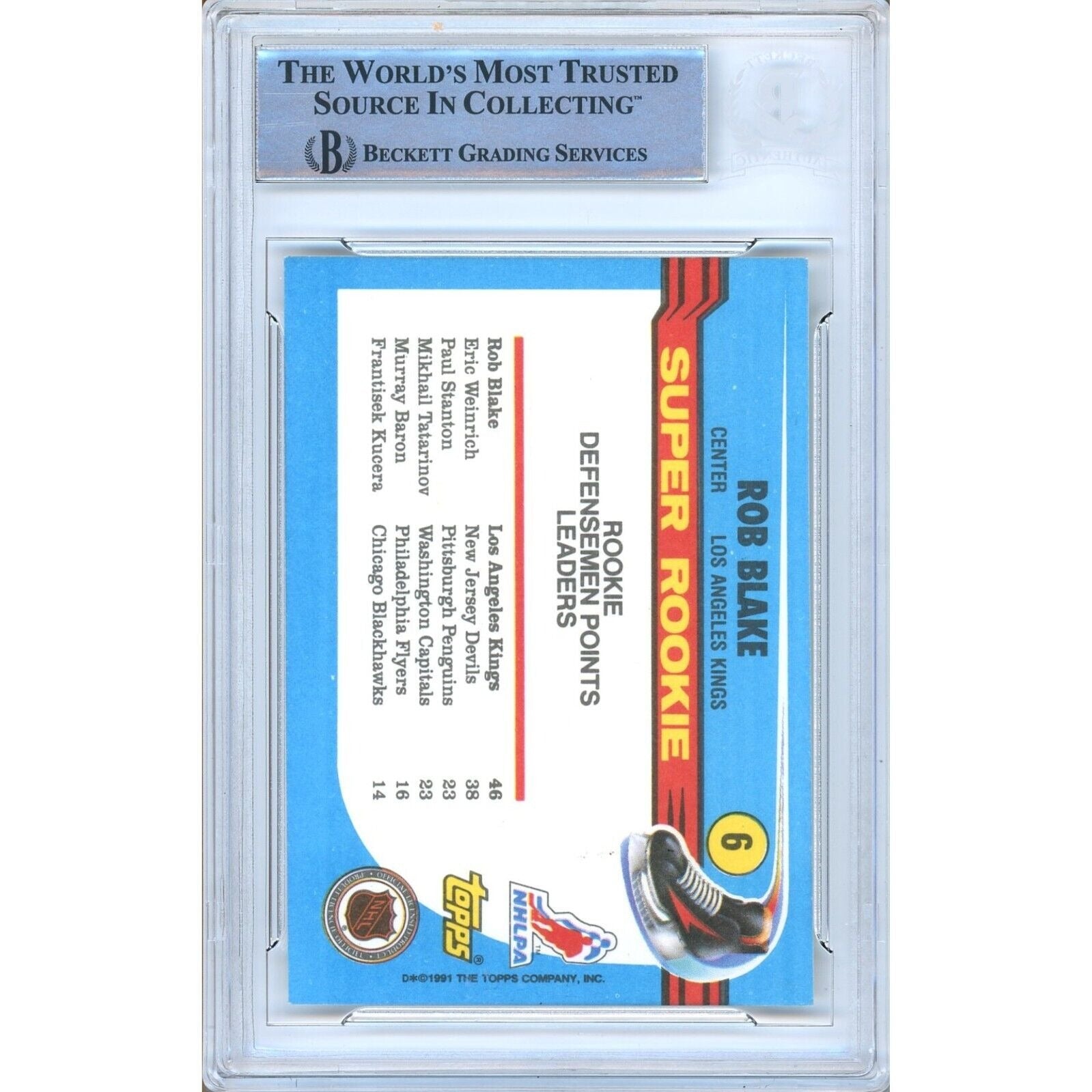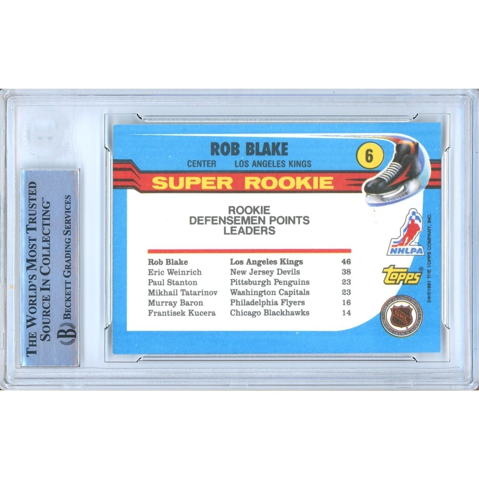 This 1991-92 Topps Super Rookie hockey card is a valuable and rare piece, featuring the autograph of former Los Angeles Kings player Rob Blake. Authenticated by Beckett Authentication Services (BAS), with certificate number 00016509257, this officially licensed hockey card is a standard size and made of quality card stock material. As part of the National Hockey League (NHL) league, it is perfect for collectors of sports trading cards and features the autograph, team name, season, and card number (6) of the legendary player. A must-have for fans, this autographed card is signed in black Sharpie and has been encapsulated by the experts at BAS for added authentication.