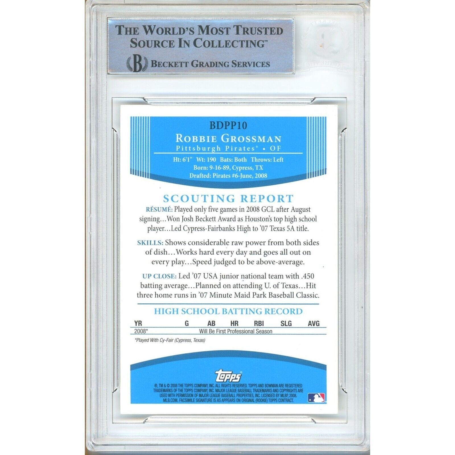 Robbie Grossman Pittsburgh Pirates Signed 2008 Bowman Draft Card Beckett Auth Auto Slab
