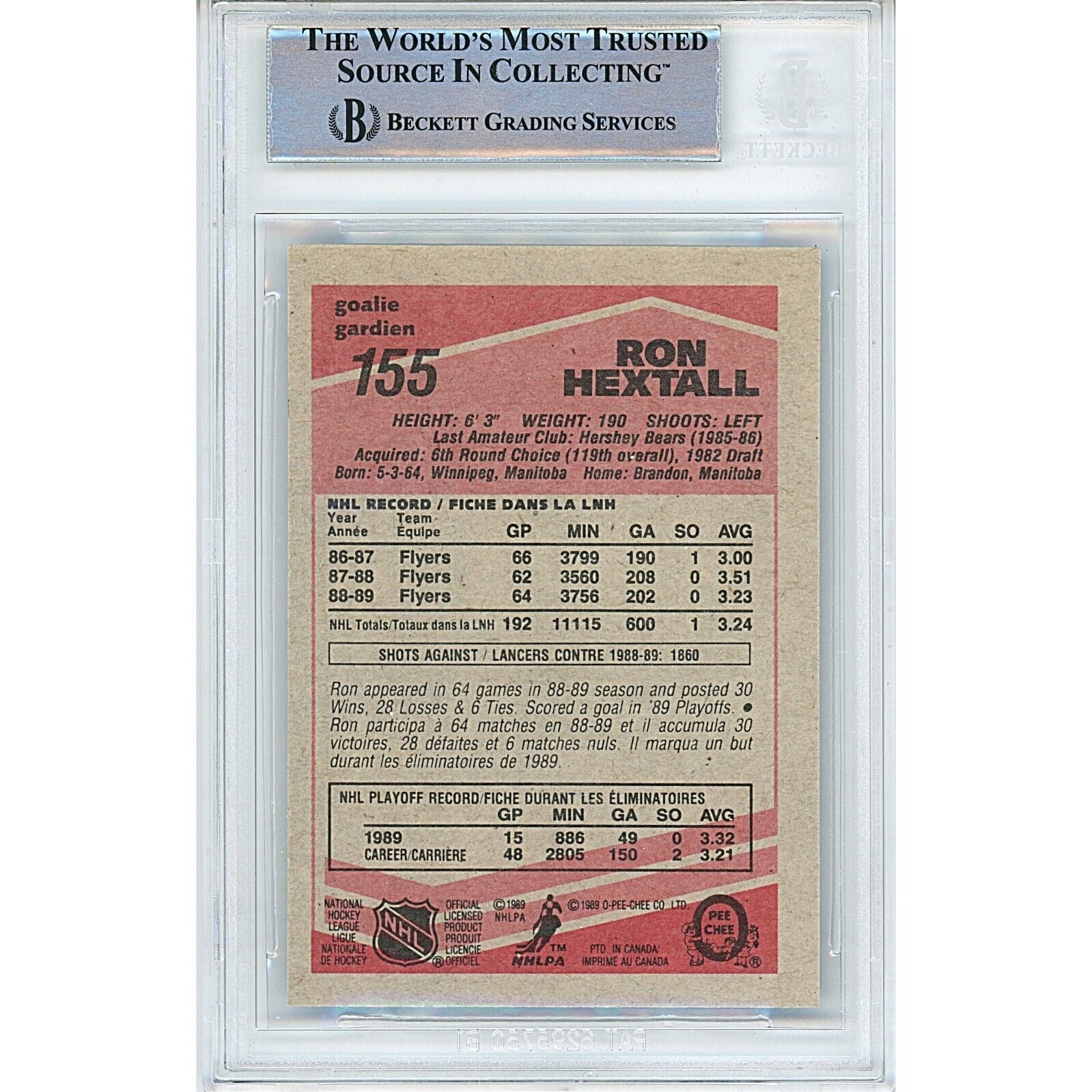 Add this authentic 1989-90 Ron Hextall hockey trading card to your NHL collection. The card features a genuine signature from Hextall and comes encapsulated for protection. This original O-Pee-Chee card is authenticated by Beckett Authentication Services with a certification number of 00014998693. A must-have for fans and collectors of the Philadelphia Flyers, NY Islanders, or Quebec Nordiques, this card is a valuable addition to any sports memorabilia assortment. Don't miss out on owning this rare and esteemed item. Signed in blue sharpie. Ron Hextall Signed Philadelphia Flyers 1989-1990 O-Pee-Chee Hockey Card #155, authenticated and encapsulated by the experts at Beckett Authentication Services (BAS). Certificate Number 00014998693.