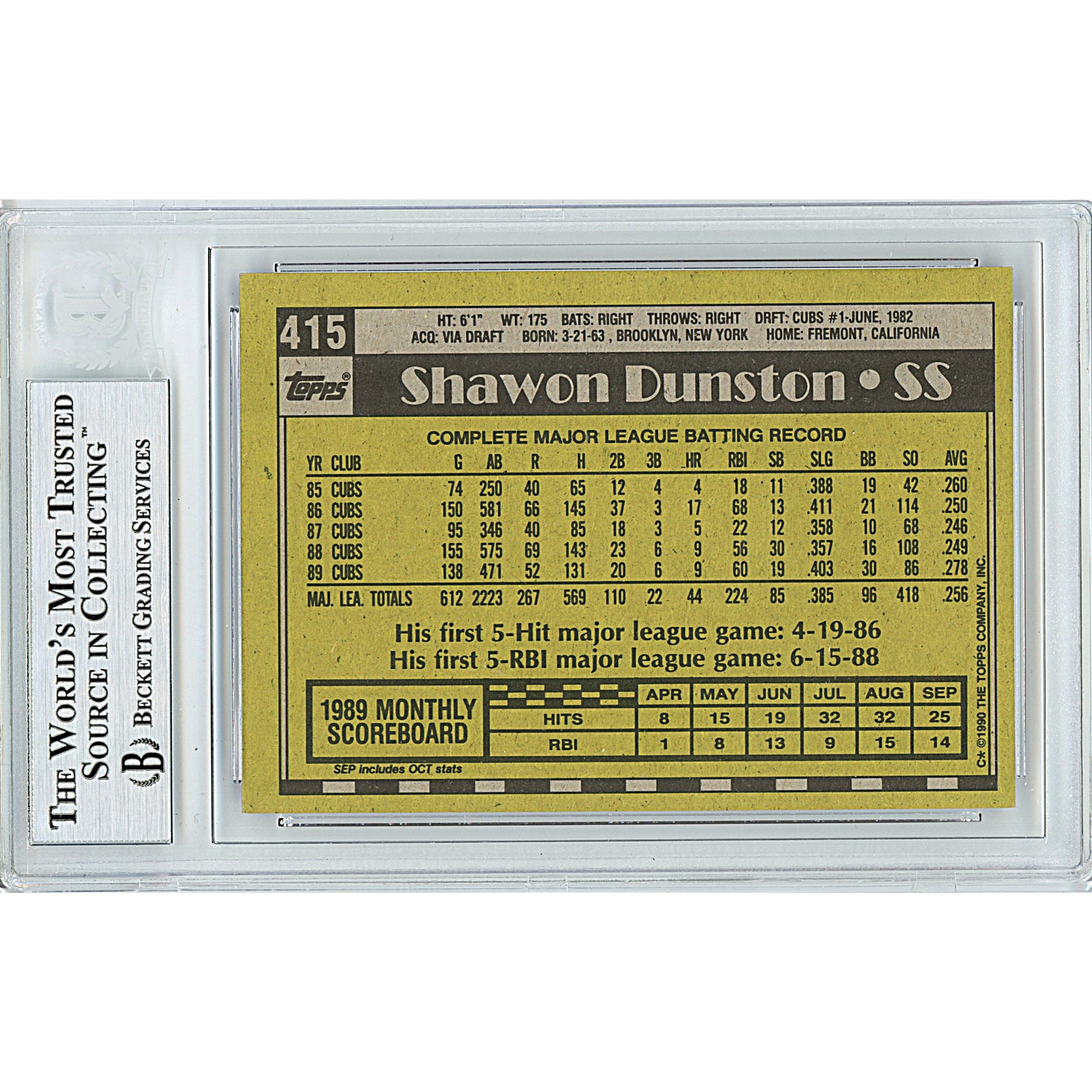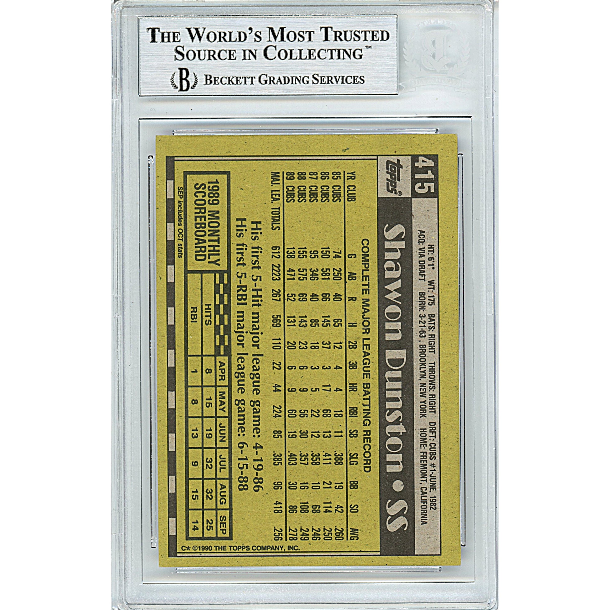 Shawon Dunston Signed Chicago Cubs 1990 Topps Baseball Card Beckett Authentic Auto Slab