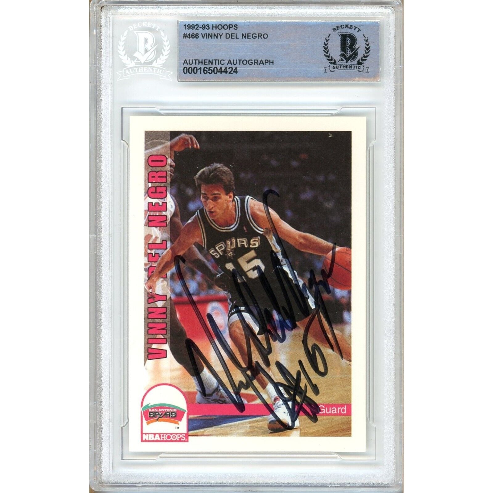 This 1991-92 NBA Hoops basketball trading card is a rare and valuable item autographed by Vinny Del Negro, a professional basketball player for the San Antonio Spurs. Crafted with high-quality card stock, it features a standard size and is officially licensed with a Beckett Authentication Services (BAS) slab. Del Negro's hard-signed autograph has an authentication number of 00016504424, making it a must-have for basketball fans and collectors who admire his career. Part of the Base Set, it includes parallel/variety autographs and has the card number 466. Manufactured in the United States in 1992, this card is a noteworthy addition to any sports trading card collection. The black Sharpie autograph has been authenticated and encapsulated by the experts at Beckett Authentication Services (BAS), with certificate number 00016504424.