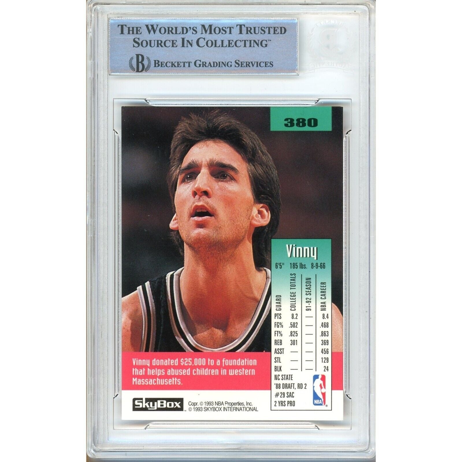 This Vinny Del Negro autographed 1992-93 Skybox basketball card is highly sought after and valuable. It showcases the former NBA player's autograph and is made of top-quality card stock material. Authenticated by Beckett Authentication Services (BAS) with authentication number 00016504423, it is a standard size card from the 1992-93 Skybox set. A must-have for collectors and basketball memorabilia fans, this card features Vinny Del Negro in his San Antonio Spurs uniform and bears the player's own signature. A coveted addition to any collection, its worth is expected to appreciate over time. Signed in black Sharpie. Vinny Del Negro Autographed San Antonio Spurs 1992-1993 Skybox Basketball Card #380. This signature has been authenticated and encapsulated by the experts at Beckett Authentication Services (BAS). Certificate Number 00016504423.
