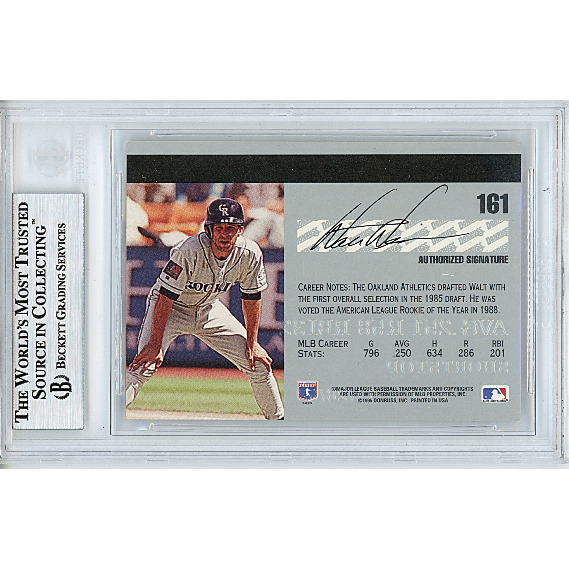 This Walt Weiss autographed 'Colorado Rockies' 1995 Donruss Studio baseball trading card #161 was authenticated by an expert from Beckett Authentication Services (BAS) and deemed genuine. The blue sharpie autograph can be verified by visiting www.Beckett-Authentication.com and using authentication number 00013191031. The card is protected in a tamper-proof BGS card holder. See images for enlarged views and browse our website for more MLB and baseball autographed collectibles. Notable Career Accomplishments: 1998 MLB All Star Game Selection, 2-Time World Series Champion (1989 and 2021).